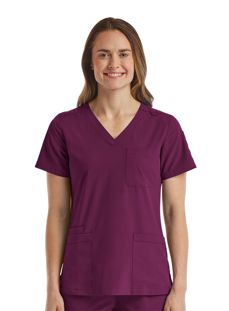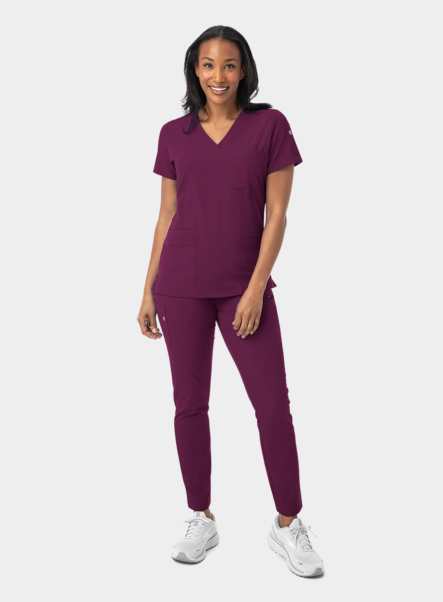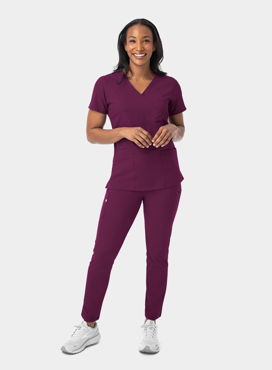 Need scrubs with pen pockets on your sleeve? A scrub top with a dedicated phone pocket? We have you covered! You’ll have no shortage of pockets with two front patch pockets, one front welt pocket, one chest pocket, one left sleeve pocket (for pens), and one left rear utility pocket (perfect for phones). There’s also a bungee loop located on the shoulder which is perfect for badges or accessories you need easy access to.