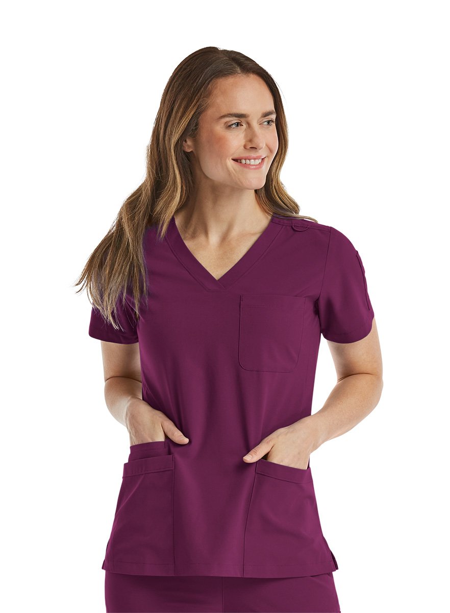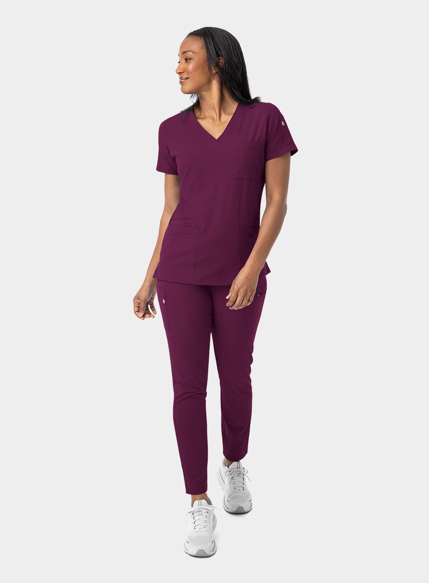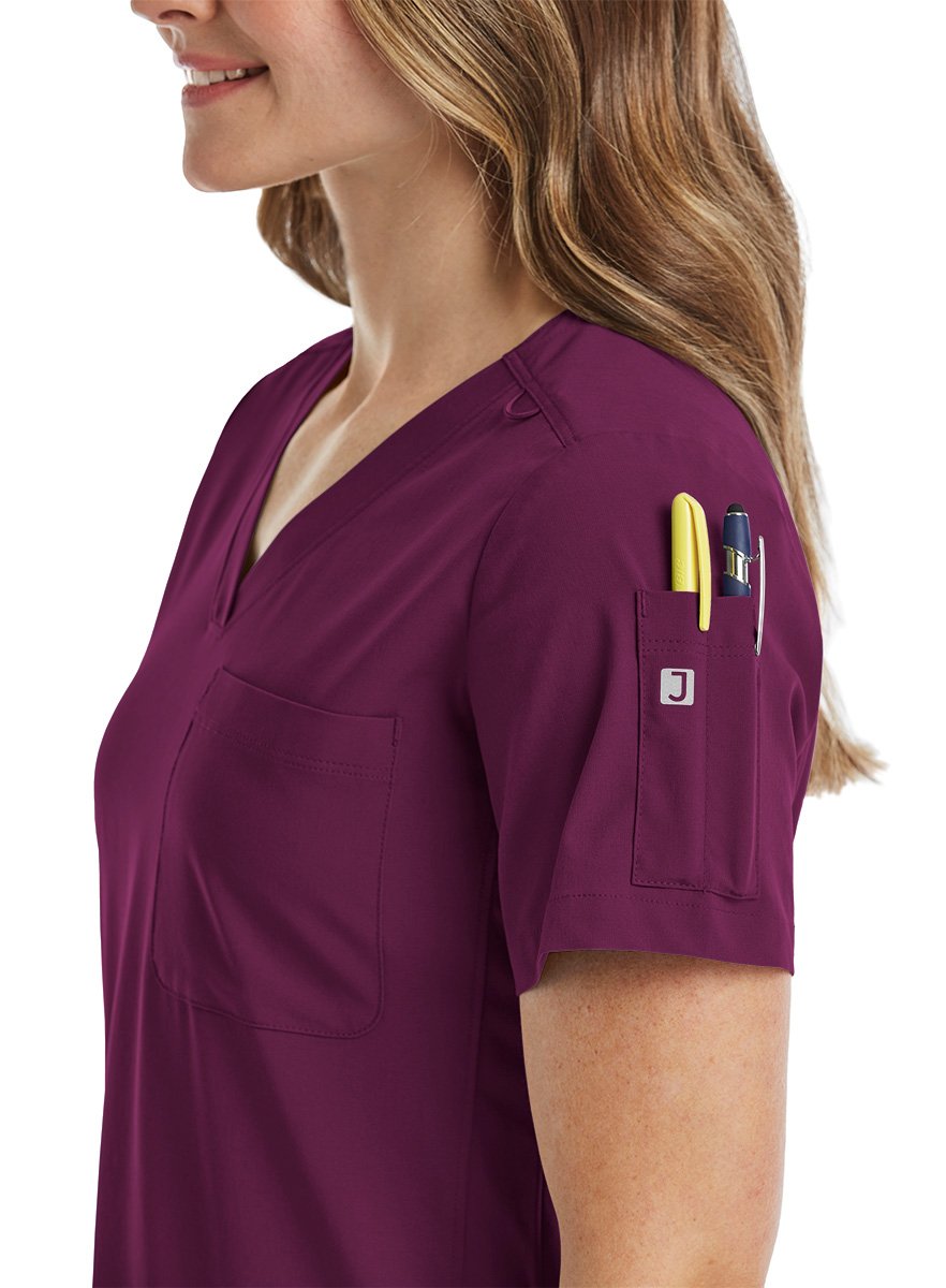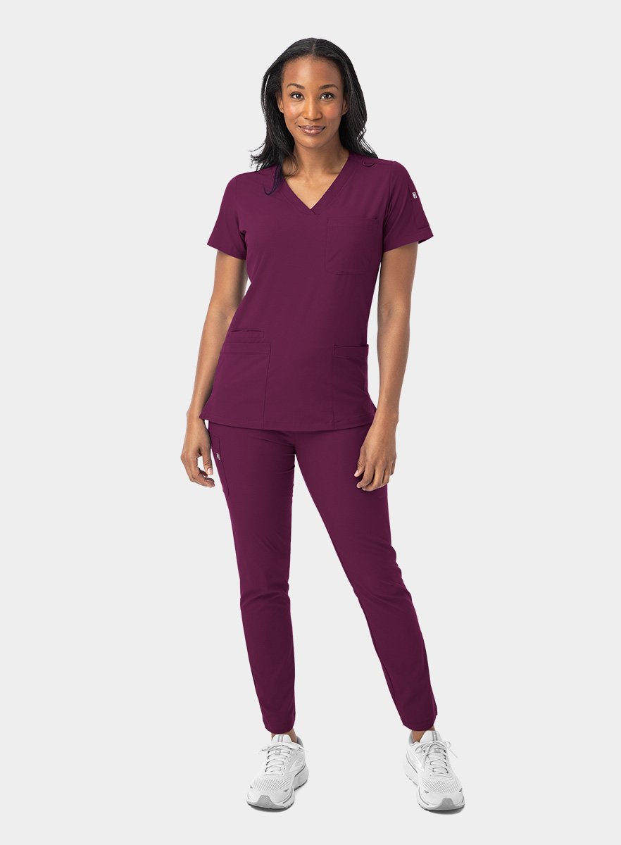 Need scrubs with pen pockets on your sleeve? A scrub top with a dedicated phone pocket? We have you covered! You’ll have no shortage of pockets with two front patch pockets, one front welt pocket, one chest pocket, one left sleeve pocket (for pens), and one left rear utility pocket (perfect for phones). There’s also a bungee loop located on the shoulder which is perfect for badges or accessories you need easy access to.