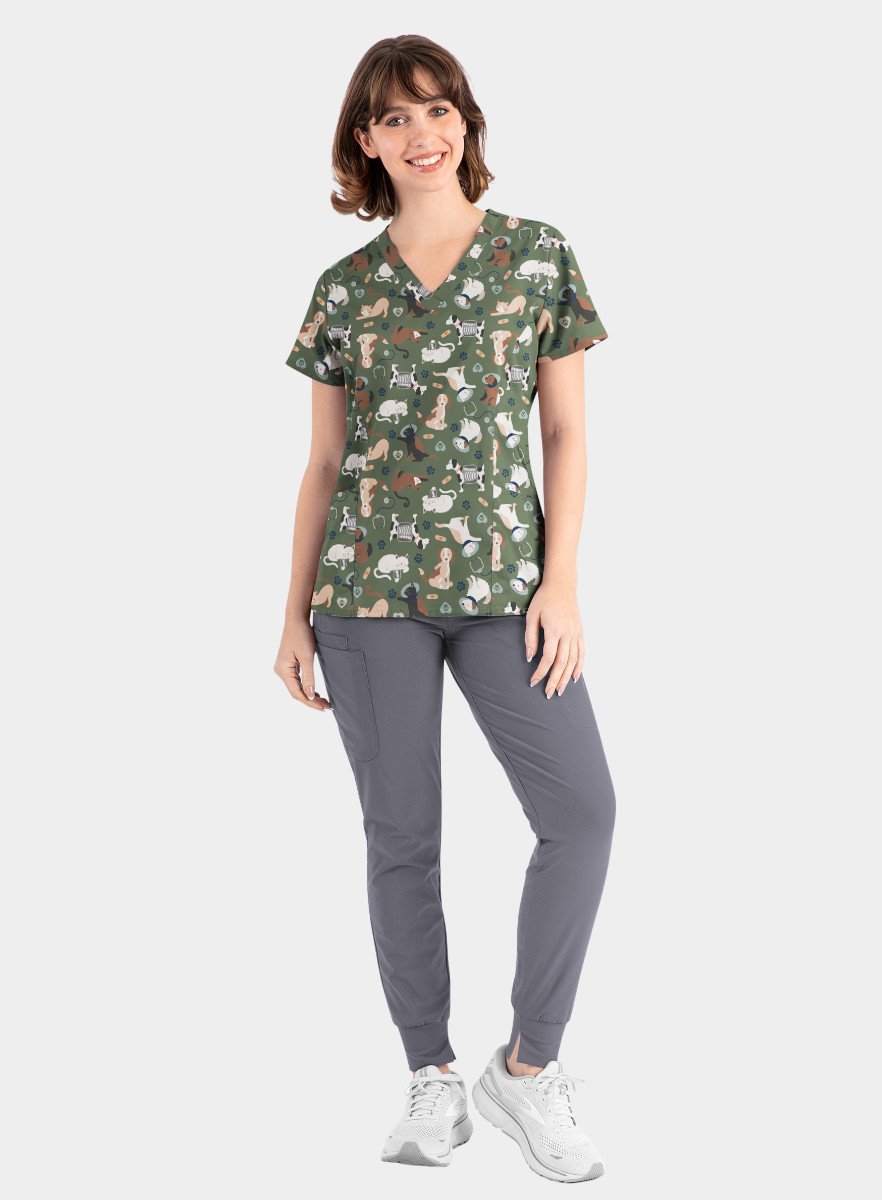 - Women’s curved V-neck printed scrub top